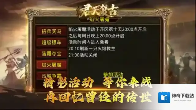 1、落霞夺宝、焰火屠魔、沙城争霸等精彩活动每周定时开放,参与就有机会获得大量金币、装备和技能奖励。
